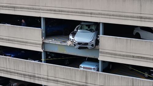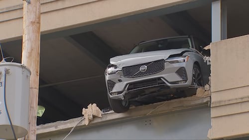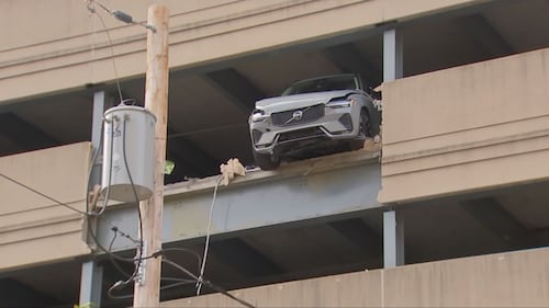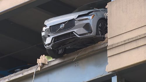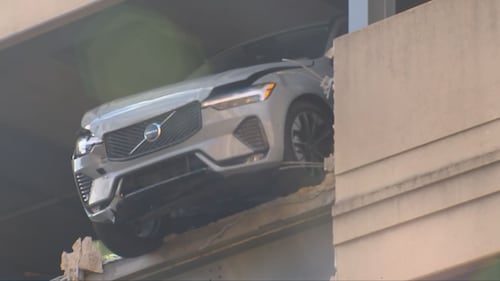 PHOTOS: Part of vehicle hangs out of parking garage at Pittsburgh hospital Drone 11 captured a closer look at a crash that caused a vehicle to hang out of a parking garage in Shadyside. (WPXI/WPXI)