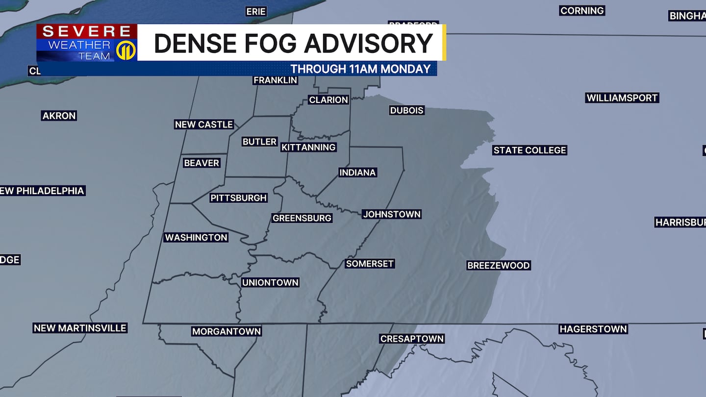 PITTSBURGH — The National Weather Service has issued a Dense Fog Advisory for our entire viewing area until 11 a.m. Monday. Dense fog will reduce visibility to a quarter mile or less tonight through Monday morning and will impact the morning commute. Dense fog could make driving hazardous. Use extra caution and make sure to use low beams or fog lights, allow extra space between you and the vehicle in front of you, slow down and allow extra time if driving/traveling.